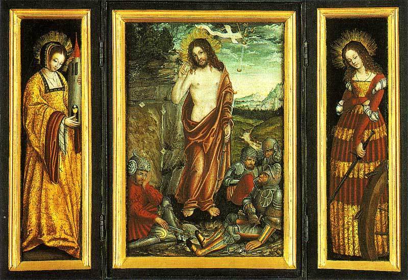 Small winged altar with the Resurrection of Christ, St. Barbara (Left Wing) and St. Catharine (right Wing), 1510, cranach, oil, panel