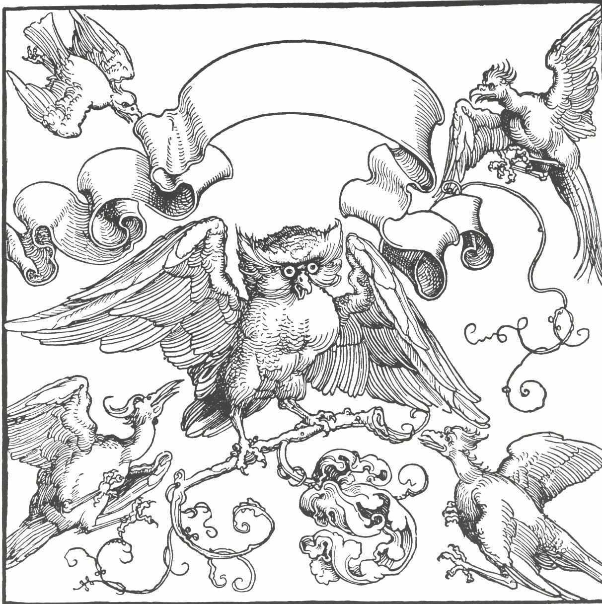 The owl in fight with other birds, durer