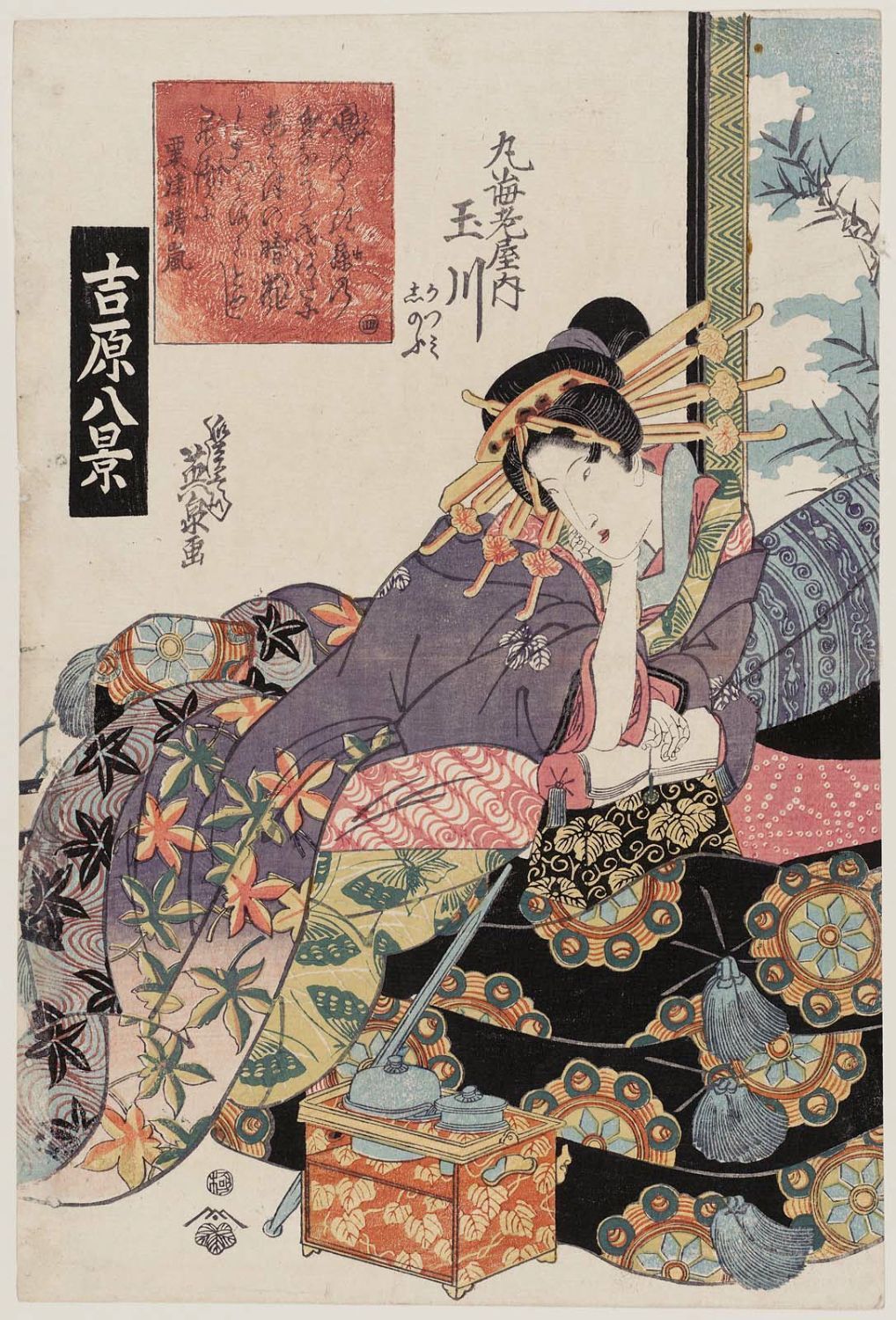 Clearing Weather at Awazu (Awazu seiran), Tamagawa of the Maru-Ebiya, kamuro Katsumi and Shinobu, No. 4 from the series Eight Views in the Yoshiwara (Yoshiwara hakkei), eisen