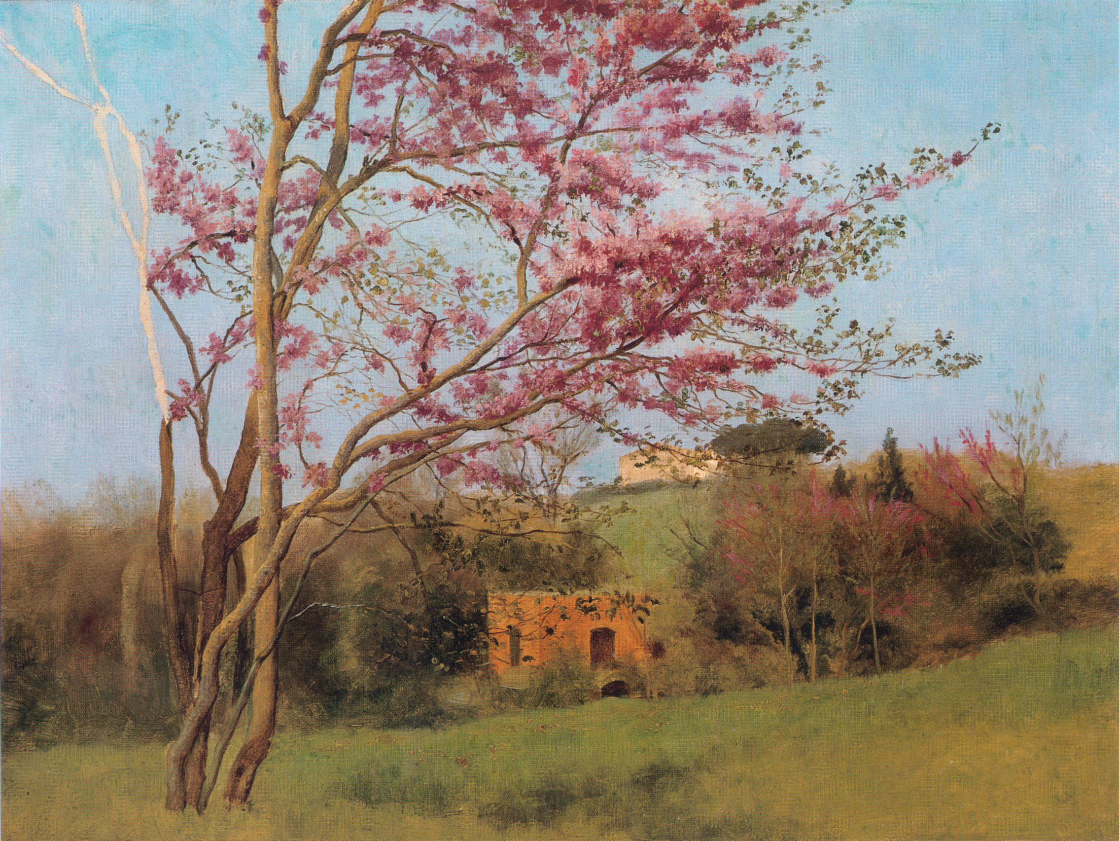 Landscape: Blossoming Red Almond, study, 1912, godward, Oil on panel, 40 x 31.7 cm, Collection of Vern and Judy Swanson, Springville, Utah, United States
