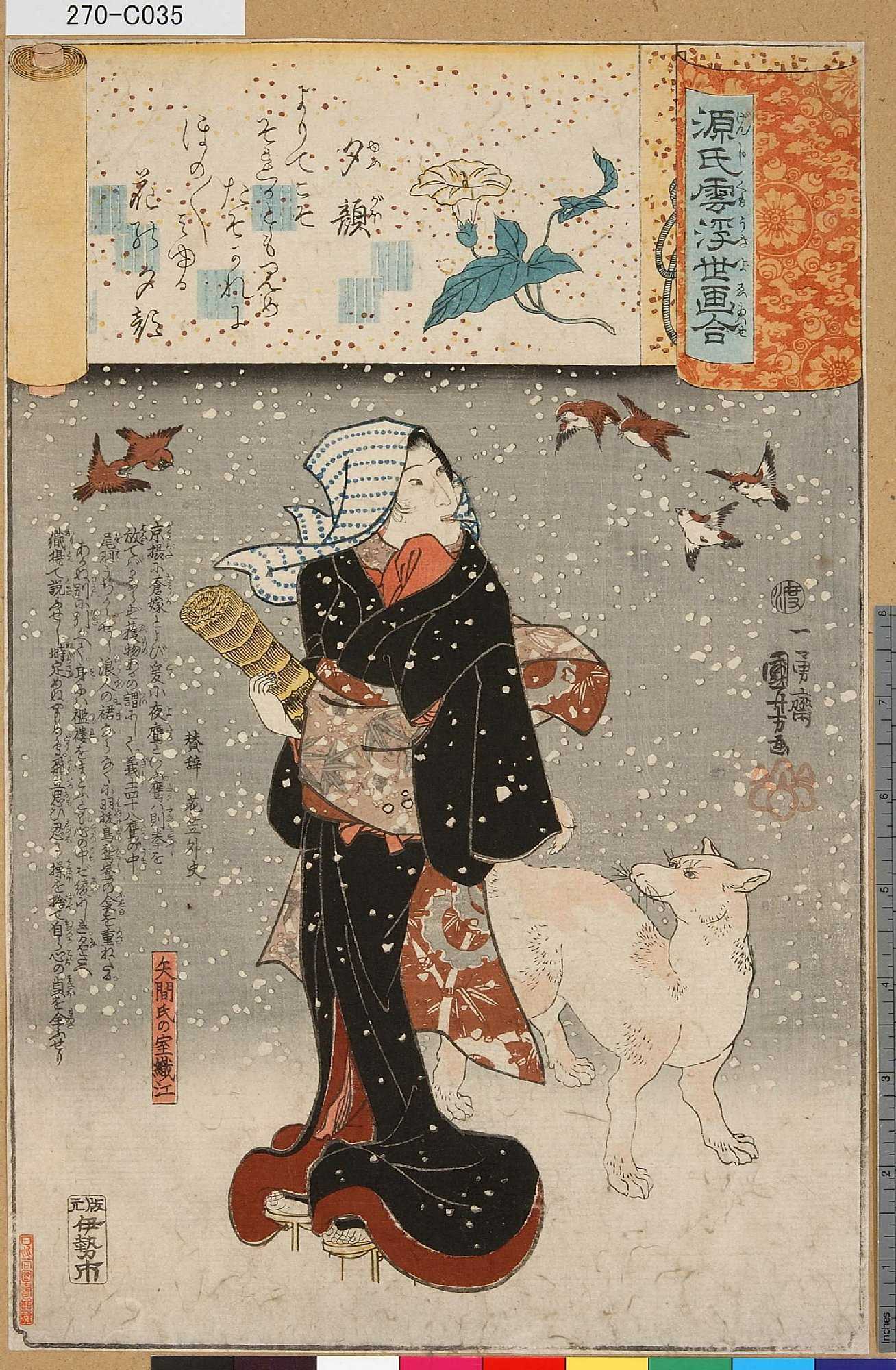 Bijin with a dog in the snow, 1845, kuniyoshi, woodcut, Private Collection