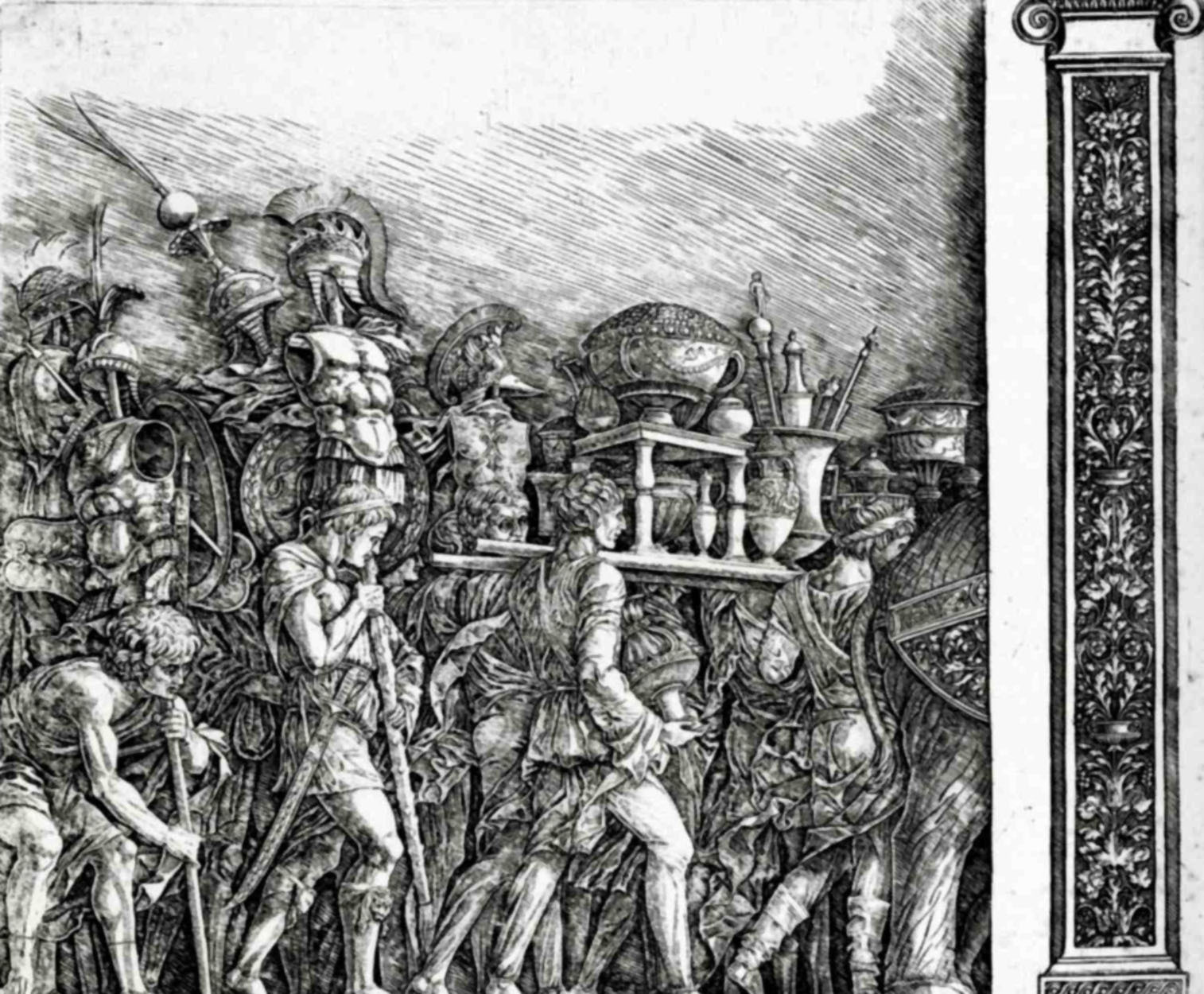 Holders of currencies and gold jewelry, trophies royal armor with pilasters, 1500, mantegna