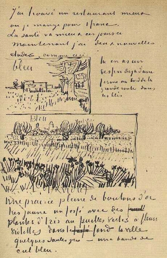Farmhouse with Wheat Field along a Road and Field with Flowers, 1888, vangogh, ink, paper