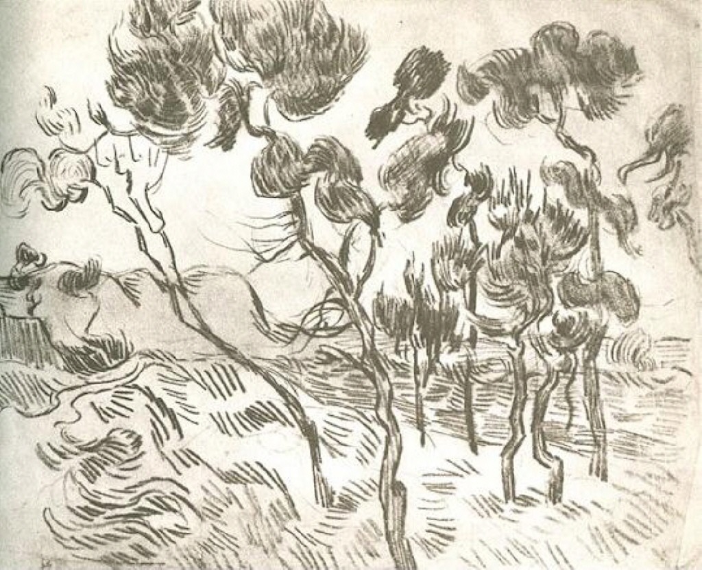 A Group of Pine Trees near a House, 1889, vangogh, chalk, paper, Private Collection